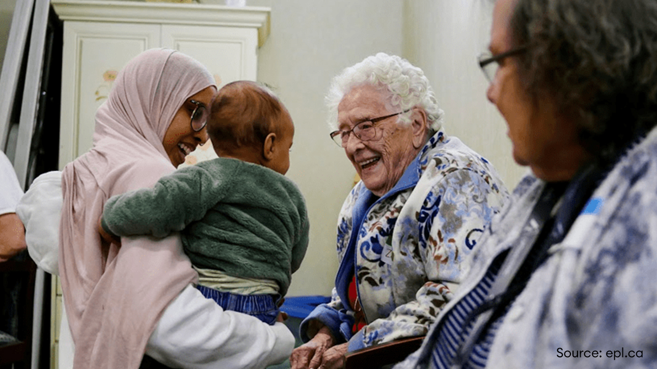 Together We Grow brings EPL’s early literacy programming to seniors’ residences and long-term care facilities, where they can be enjoyed by seniors and young families together. The program promotes social connection, reduces feelings of loneliness, and creates meaningful interactions that benefit participants of all ages.